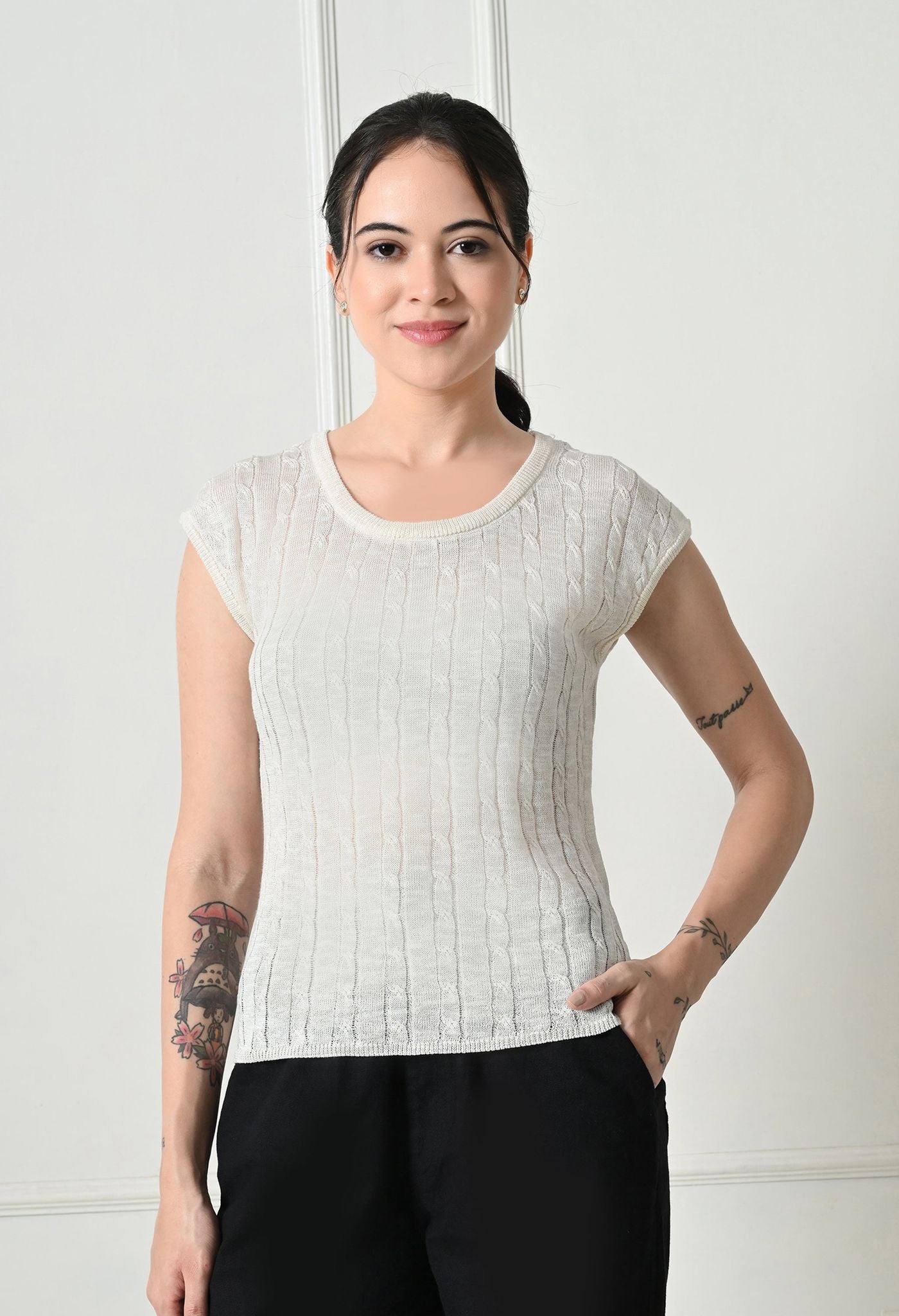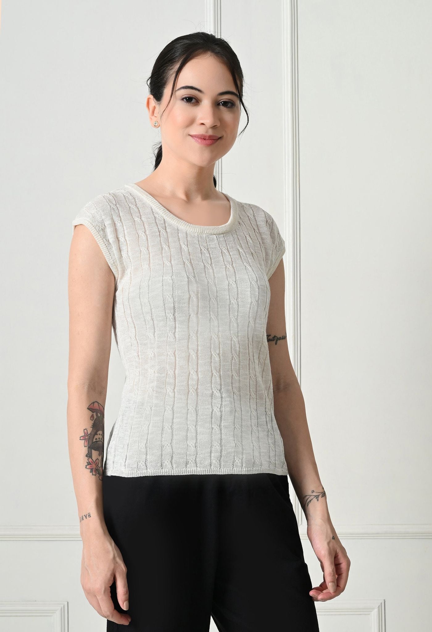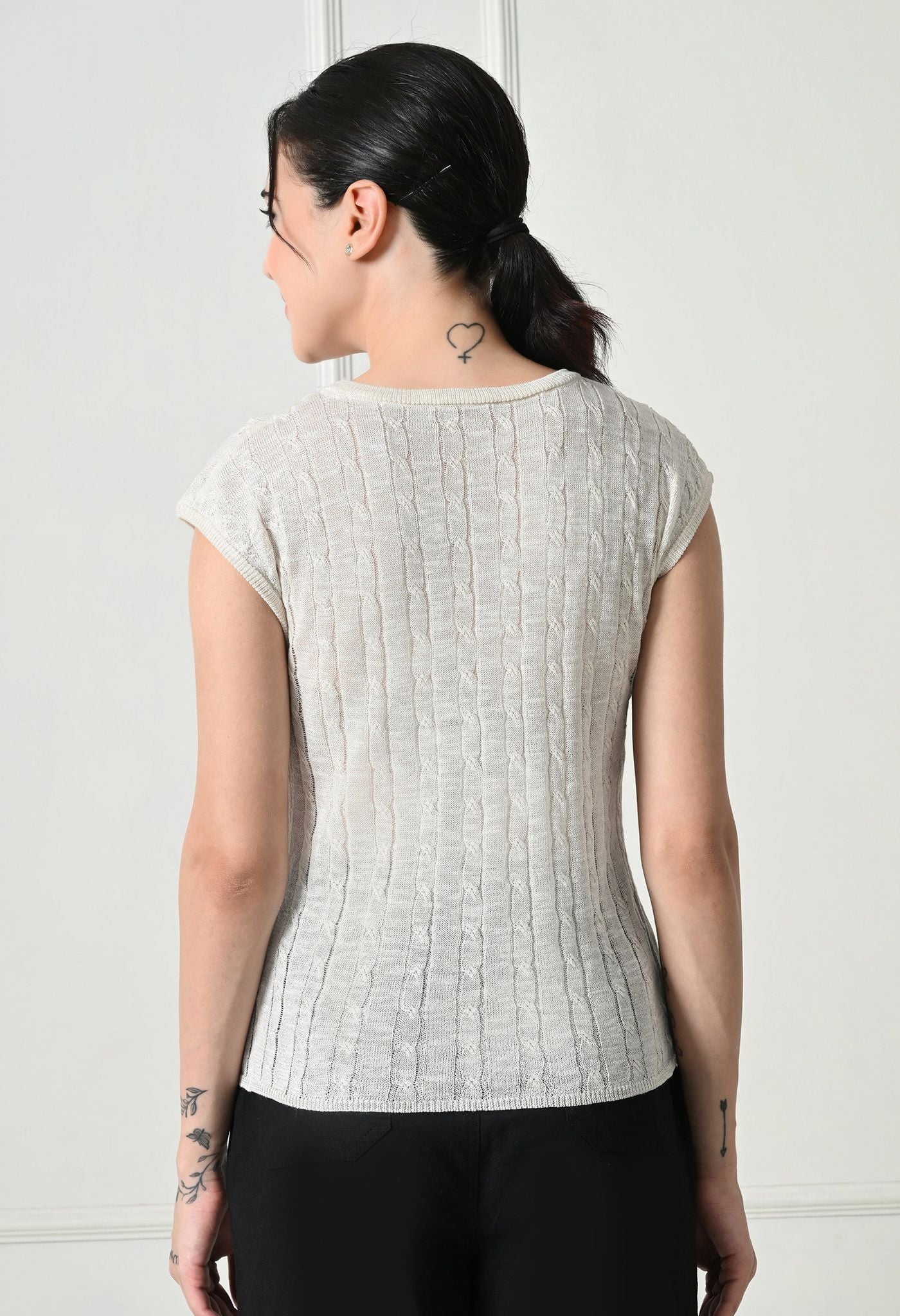Soft, airy, and quietly elegant — the Light Cable Knit Cap Sleeve Top is crafted for effortless comfort with timeless appeal. Made from a breathable, lightweight knit, it features a delicate cable texture and a natural tone that pairs seamlessly with everything.
