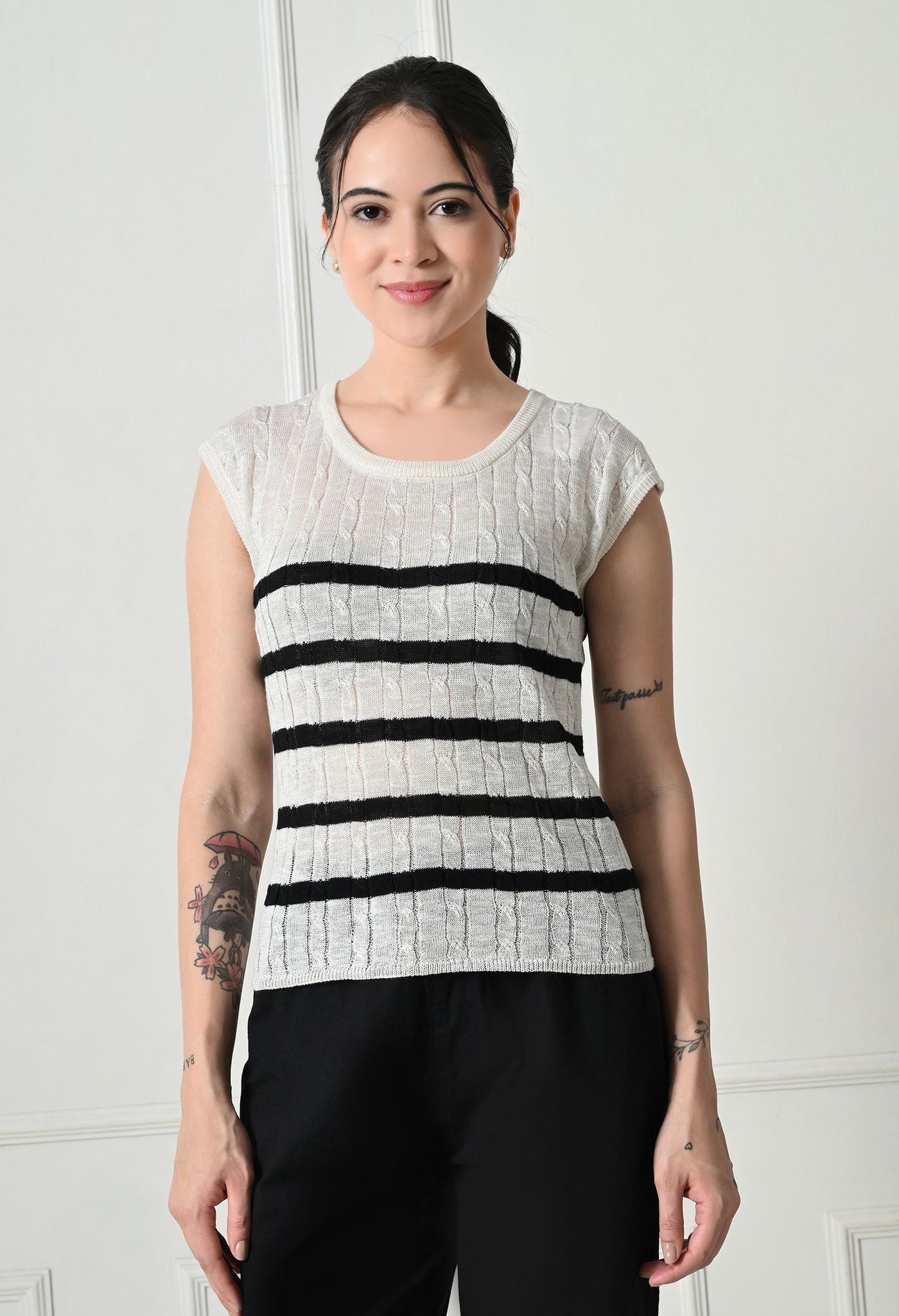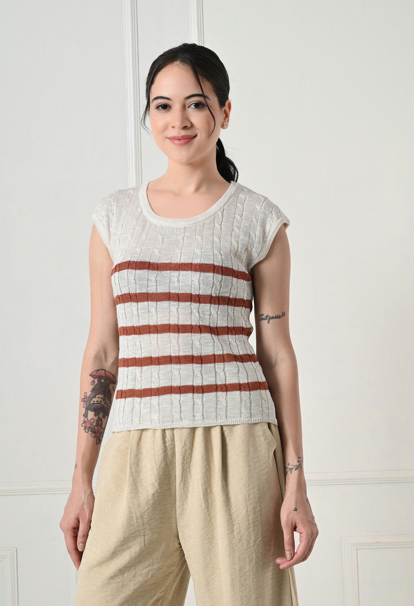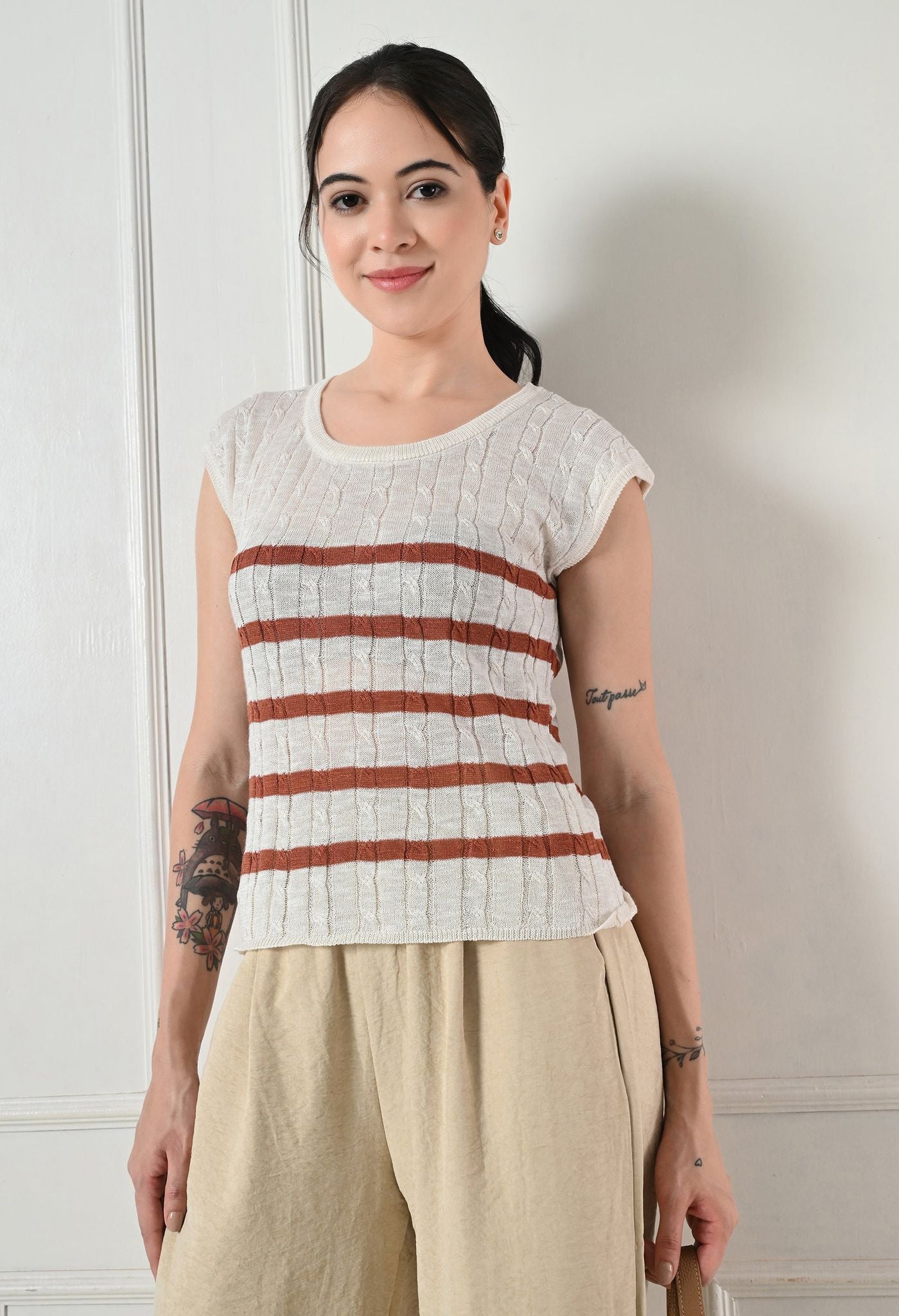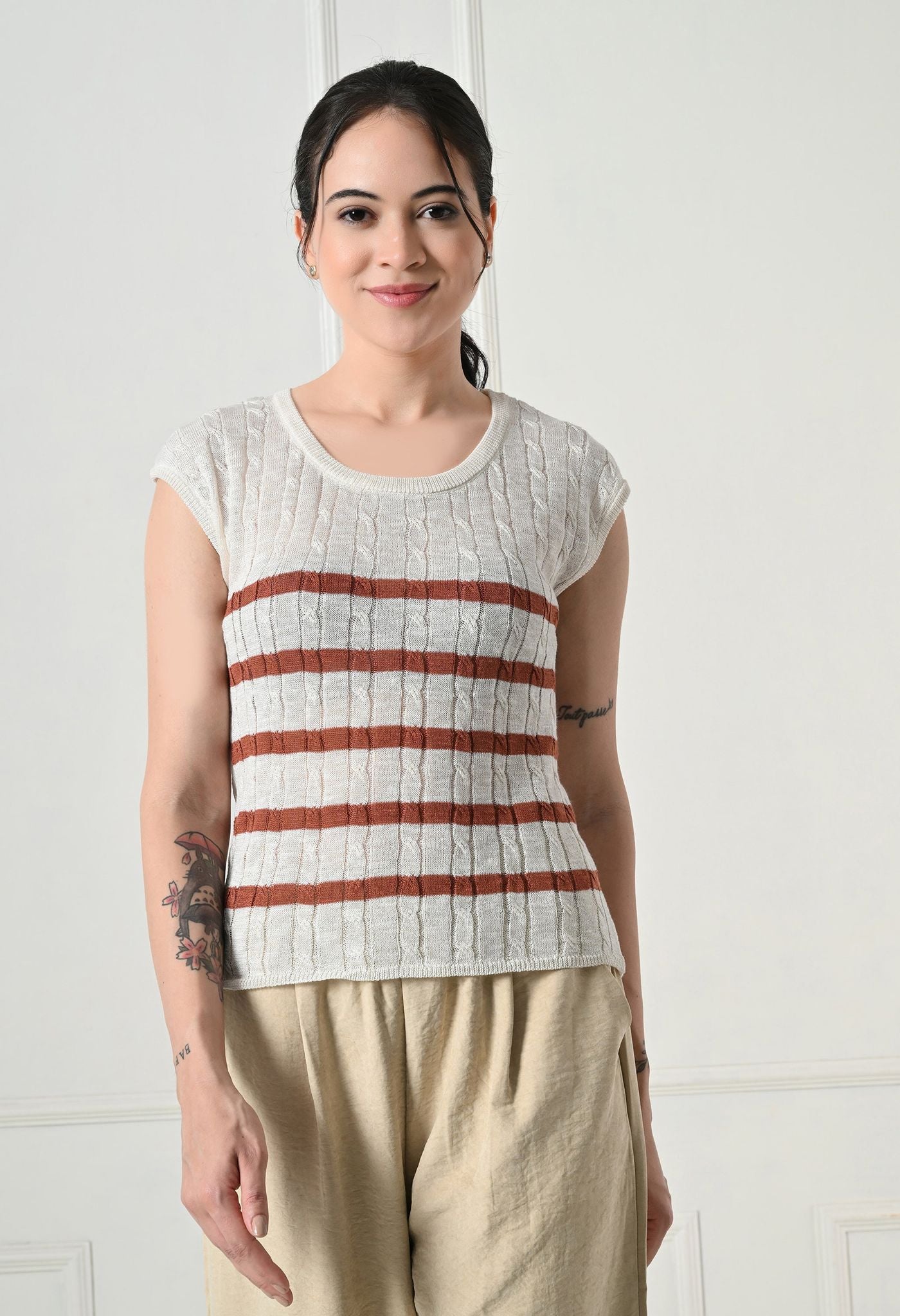 Stay effortlessly chic with our Textured Knit Cap Sleeve Top, blending comfort and style in one easy-to-wear piece. This top is a refreshing twist on a timeless design. The cable-knit texture adds depth and character, while the cap sleeves and relaxed fit make it ideal for day-long wear.
